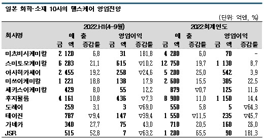 일본 화학‧소재 10사 가운데 5사는 2022회계연도(2022년 4월-2023년 3월) 헬스케어 사업 영업이익 전망치를 상향 조정한 것으로 나타났다.