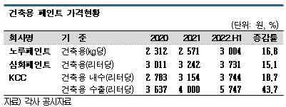 2022년 상반기 노루페인트는 건축용 매출이 1899억원으로 4.7%, 조광페인트는 건축용으로 분류된 조합페인트, 에나멜, 수성페인트의 총 매출이 71억원으로 24..8% 삼화페인트는 페인트부문 매출이 2174억원으로 6.4%, KCC는 7621억원으로 8.2%, 강남제비스코는 1283억원으로 4.7% 증가했다.