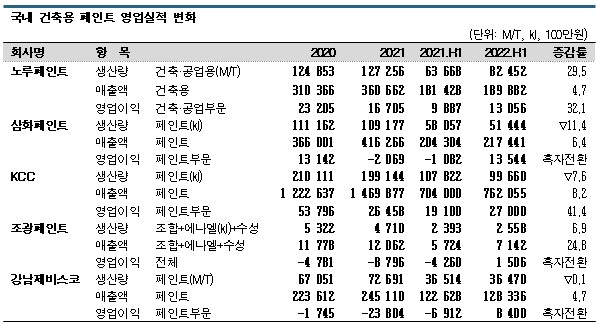 페인트 생산기업들마다 공개하는 정보 기준이 달라 직접적인 비교는 어려우나 2022년 상반기에는 노루페인트가 건축용 페인트 생산량을 29.5% 늘린 것으로 파악된다. 삼화페인트, KCC, 조광페인트는 생산량이 7-15% 감소했으나 삼화페인트와 조광페인트는 흑자로 전환했고 KCC 역시 페인트 부문 영업이익이 41.4% 증가했다.