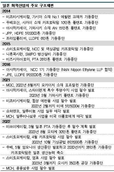 일본 정부는 산업제품 공급과잉에 대응한 구조재편을 촉진하기 위해 산업경쟁력강화법 50조를 시행한 이후 2014-2016년 NCC(Naphtha Cracking Center) 3기 가동중단을 유도했고 현재는 에틸렌 생산능력 615만톤의 스팀 크래커 13기만 가동하고 있다.