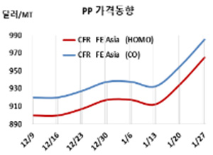 아시아 PP 시세는 1월25일 CFR FE Asia 기준 라피아(Raffia)/인젝션(Injection) 그레이드가 톤당 965달러로 30달러, IPP Film은 970달러로 25달러, BOPP는 975달러로 30달러, 블록 코폴리머(Block Copolymer)는 985달러로 30달러 폭등했다.