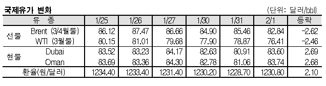 2월1일 국제유가는 미국의 재고 증가 영향으로 폭락했다. 국제유가는 미국 원유 재고가 정제가동률 하락 및 수출 감소로 예상치보다 큰 폭으로 증가한 영향으로 폭락했다. 표, 그래프: <국제유가 변화> <화학저널 2023/02/02> |