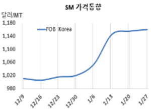SM(Styrene Monomer)은 소폭 상승했다. SM 시세는 1월27일 FOB Korea가 톤당 1160달러로 5달러, CFR SE Asia도 1190달러로 5달러 상승했다. CFR China와 CFR Taiwan도 1160달러로 5달러 올랐고, CFR India 역시 1250달러로 5달러 상승했다. 표, 그래프: <SM 가격동향> <화학저널 2023/02/02> |