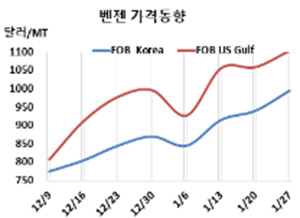 벤젠(Benzene)은 상승세를 이어갔다. 벤젠 시세는 1월27일 FOB Korea가 톤당 995달러로 55달러 급등했고 CFR SE Asia는 990달러로 35달러 상승했다. CFR China도 990달러로 35달러 올랐다. 표, 그래프: <Benzene 가격동향> <화학저널 2023/02/02> |