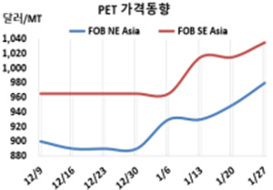 PET(Polyethylene Terephthalate)는 상승세로 전환했다. 병(Bottle) 그레이드 PET 시세는 1월25일 FOB NE Asia가 980달러로 30달러, FOB SE Asia는 1065달러로 30달러 급등했다. CFR S Asia도 1030달러로 10달러 올랐다. 표, 그래프: <PET 가격동향> <화학저널 2023/02/03> |