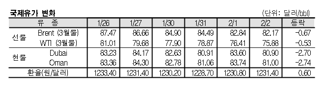 <표, 그래프: 국제유가 변화> <화학저널 2023/02/03> |