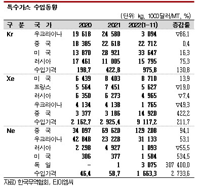 우크라이나산 특수가스는 2022년 1-11월 크립톤 수입량이 3094kg으로 전년동기대비 87.4%, 제논은 1765kg으로 49.3%, 급감했고 네온은 3만1133kg으로 53.1% 급증한 대신 러시아산 수입량은 1093kg으로 55.5% 급감했다.