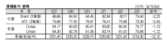 2월3일 국제유가는 미국 고용지표가 강세를 보임에 따라 폭락했다. 국제유가는 미국 신규 일자리가 폭증하고 실업률이 낮아진 영향으로 폭락했다. <표, 그래프: 국제유가 변화> <화학저널 2023/02/06> |