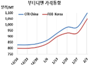 부타디엔 시세는 2월3일 FOB Korea가 톤당 1050달러로 120달러 폭등했고 CFR SE Asia도 1000달러로 100달러 폭등했다. 그러나 CFR China와 CFR Taiwan은 1100달러로 30달러 상승에 그쳤다.