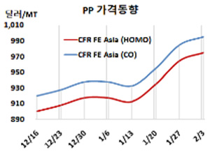 아시아 PP 시세는 2월1일 CFR FE Asia 기준 라피아(Raffia) 및 인젝션(Injection) 그레이드가 톤당 975달러, IPP Film은 980달러, BOPP는 985달러, 블록 코폴리머(Block Copolymer)는 995달러로 각각 10달러 상승했다.