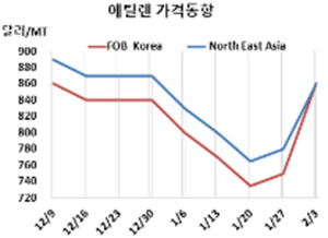CFR NE Asia 860달러로 80달러 치솟아 … 3월 정기보수 이유로