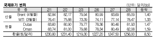 2월8일 국제유가는 연준(Fed)의 긴축강도 완화에 대한 기대감이 향상됨에 따라 급등했다. 국제유가는 미국 긴축강도 완화에 대한 전망과 튀르키예(터키) 지진 영향으로 급등했다. <표, 그래프: 국제유가 변화> <화학저널 2023/02/09> |