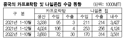 카프로락탐(CPL: Caprolactam)은 러시아가 중국을 통해 우회 공급하고 있다. 표, 그래프: <중국의 카프로락탐 및 나일론칩 수급 동향> <화학저널 2023/02/09> |