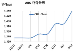 ABS 시세는 2월8일 CFR China 톤당 1440달러로 50달러, CFR SE Asia도 1440달러로 50달러 폭등했다. CFR S Asia 역시 1490달러로 60달러 치솟았다.
