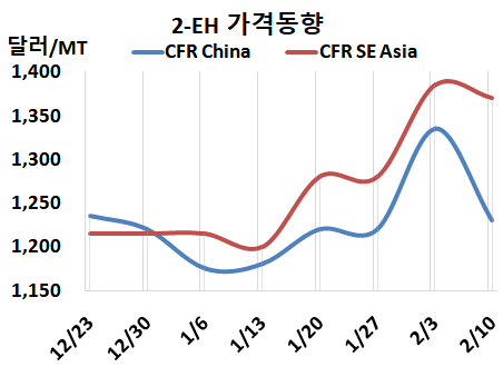 옥소알코올(Oxo-Alcohol)은 대폭락했다. 2-EH(Ethylhexanol) 시세는 2월10일 CFR China가 톤당 1230달러로 105달러 폭락했고, CFR SE Asia는 1370달러로 15달러 하락했다. 지난 주 1300달러를 돌파하며 대폭등했으나 바로 대폭락했다. 표, 그래프: <2-EH 가격동향> <화학저널 2023/02/17> |