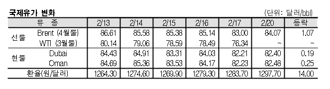 한국석유공사에 따르면, 런던원유거래소(ICE)의 브렌트유(Brent) 선물유가는 배럴당 84.07달러로 전일대비 1.07달러 상승했고, 뉴욕상업거래소(NYMEX)의 WTI(서부텍사스 경질유)는 미국 Presidents' Day 휴일로 거래되지 않았다.