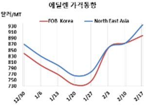 에틸렌 시세는 2월17일 CFR NE Asia가 톤당 935달러로 60달러, CFR SE Asia도 890달러로 55달러 급등했다. FOB Korea는 900달러로 25달러 상승했다.