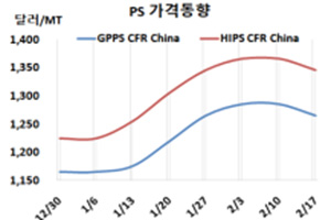 PS(Polystyrene)는 일제히 하락했다. GPPS(General Purpose PS) 시세는 2월15일 CFR China가 1265달러로 20달러, CFR SE Asia는 1285달러로 30달러 하락했다. CFR India도 1305달러로 20달러 떨어졌다. 표, 그래프: <PS 가격동향> <화학저널 2023/02/22> |