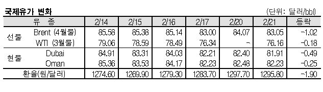 2월21일 국제유가는 세계 경기침체 우려에 따라 하락했다. 국제유가는 최근 경기침체 우려가 고조된 영향으로 하락했다. 표, 그래프: <국제유가 변화> <화학저널 2023/02/22> |
