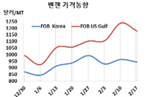 벤젠(Benzene)은 하락이 불가피했다. 벤젠 시세는 2월17일 FOB Korea가 톤당 945달러로 20달러, CFR SE Asia도 950달러로 20달러 하락했다. CFR China 역시 955달러로 20달러 떨어졌다. 표, 그래프: <Benzene 가격동향> <화학저널 2023/02/22> |