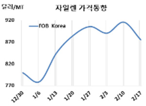 M-X(Mixed-Xylene)는 크게 하락했다. 용제(Solvent) 그레이드 M-X 시세는 2월17일 FOB Korea가 톤당 875달러로 40달러, CFR SE Asia도 935달러로 40달러 하락했다. 반면, CFR China는 890달러로 20달러 상승했다. 표, 그래프: <자일렌 가격동향> <화학저널 2023/02/23> |