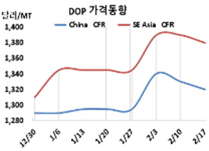 DOP(Dioctyl Phthalate)는 하락했다. DOP 시세는 2월17일 CFR China가 1320달러로 10달러 하락했고 CFR SE Asia는 1380달러로 10달러 떨어졌다. 표, 그래프: <DOP 가격동향> <화학저널 2023/02/24> |