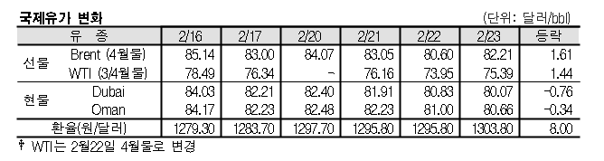 2월23일 국제유가는 러시아산 원유 공급 차질에 대한 우려가 확산됨에 따라 급등했다. 국제유가는 러시아산 원유 공급 차질 우려 영향으로 급등했다. <표, 그래프: 국제유가 변화> <화학저널 2023/02/24> |