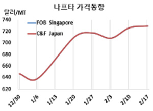나프타(Naphtha)는 소폭 상승했다. 나프타 시세는 2월17일 C&F Japan 톤당 729달러로 3달러 상승했다. 표, 그래프: <Naphtha 가격동향> <화학저널 2023/02/24> |
