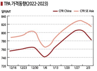 PTA 시세는 2023년 2월3일 CFR China가 775달러로 25달러, CFR SE Asia는 810달러로 15달러 하락했다.