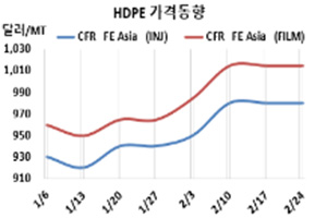 HDPE 시세는 2월22일 인젝션(Injection) 그레이드 기준 CFR FE Asia가 톤당 980달러로 변동이 없었으나 CFR SE Asia는 1065달러로 5달러 상승했다. CFR S Asia는 1135달러로 보합세를 형성했다.