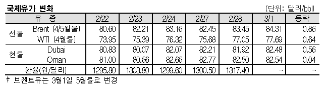 3월1일 국제유가는 중국의 수요 개선 기대를 타고 상승했다. 국제유가는 중국 경제지표 개선에 따른 수요 회복 전망을 타고 상승했다. 표, 그래프: <국제유가 변화> <화학저널 2023/03/02> |