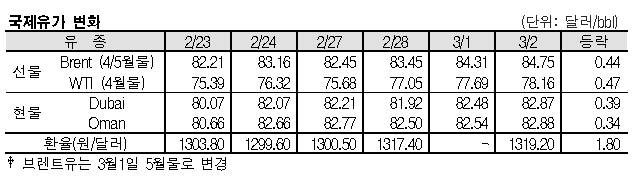 3월2일 국제유가는 중국의 수요 개선 기대를 타고 상승했다. 국제유가는 중국 경기 회복에 대한 기대가 반영되면서 상승했다. 표, 그래프: <국제유가 변화> <화학저널 2023/03/03> |