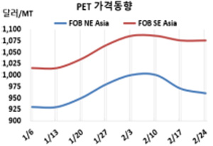PET(Polyethylene Terephthalate)는 또 떨어졌다. 병(Bottle) 그레이드 PET 시세는 2월22일 FOB NE Asia가 960달러로 10달러 하락했으나, FOB SE Asia는 1075달러로 변동이 없었다. CFR S Asia는 1025달러로 15달러 떨어졌다. 표, 그래프: <PET 가격동향> <화학저널 2023/03/03> |