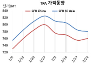 PTA(Purified Terephthalic Acid)는 등락이 엇갈렸다. PTA 시세는 2월24일 CFR China가 톤당 760달러로 5달러 상승했고 CFR SE Asia는 780달러로 5달러 하락했다. 표, 그래프: <TPA가격동향> <화학저널 2023/03/03> |