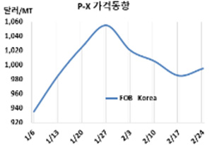P-X(Para-Xylene)는 소폭 반등했다. P-X 시세는 2월24일 FOB Korea가 톤당 995달러로 10달러, CFR SE Asia는 1020달러로 20달러 상승했다. CFR Taiwan도 1025달러로 20달러 올랐다. 표, 그래프: <P-X 가격동향> <화학저널 2023/03/03> |