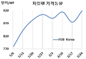 M-X(Mixed-Xylene)는 일제히 상승했다. 용제(Solvent) 그레이드 M-X 시세는 2월24일 FOB Korea가 톤당 920달러로 45달러, CFR SE Asia도 980달러로 45달러 급등했다. CFR China도 930달러로 40달러 올랐다. 표, 그래프: <자일렌 가격동향> <화학저널 2023/03/03> |
