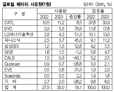 LG에너지솔루션(대표 권영수)은 글로벌 시장에서 영향력이 약화되고 있다. 표, 그래프: <글로벌 배터리 사용량(1월)> <화학저널 2023/03/06> |