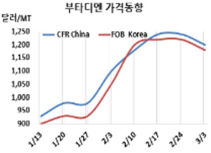부타디엔(Butadiene)은 하락이 불가피했다. 부타디엔 시세는 3월3일 FOB Korea가 톤당 1180달러, CFR SE Asia는 1130달러로 각각 40달러 하락했다. CFR China와 CFR Taiwan도 1200달러로 40달러 떨어졌다. 표, 그래프: <Butadiene 가격동향> <화학저널 2023/03/07> |
