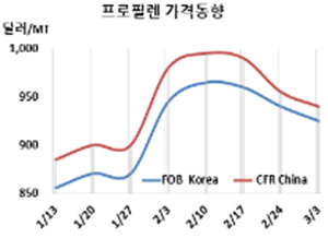 프로필렌(Propylene)은 3주 연속 하락했다. 프로필렌 시세는 3월3일 FOB Korea가 톤당 925달러로 15달러, CFR SE Asia도 960달러로 15달러 하락했다. CFR China는 940달러, CFR Taiwan은 955달러로 각각 15달러 떨어졌다. 표, 그래프: <Propylene 가격동향> <화학저널 2023/03/07> |