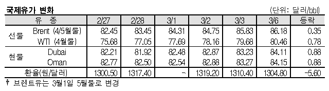 3월6일 국제유가는 사우디가 판매가격(OSP)을 인상한 영향으로 상승했다. 사우디는 아시아와 유럽에 대한 OSP를 인상함으로써 국제유가 상승을 이끌어냈다. 표, 그래프: <국제유가 변화> <화학저널 2023/03/07> |