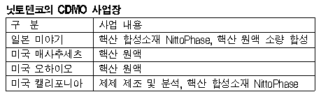 닛토덴코(Nitto Denko)가 핵산 의약품 위탁개발‧생산(CDMO) 사업 확장에 나서 주목된다. 표, 그래프: <닛토덴코의 CDMO 사업장> <화학저널 2023/03/07> |