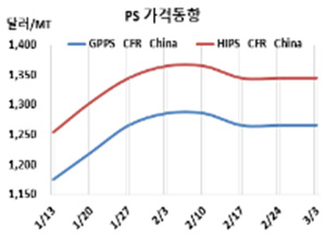 PS(Polystyrene)는 변동이 없었다. GPPS(General Purpose PS) 시세는 3월1일 CFR China 1265달러, CFR SE Asia 1285달러로 변동이 없었다. CFR India도 1305달러로 보합세를 형성했다. 표, 그래프: <PS 가격동향> <화학저널 2023/03/08> |