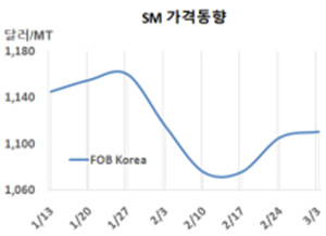 SM 시세는 3월3일 FOB Korea가 톤당 1110달러로 5달러 상승했으나 CFR SE Asia는 1145달러로 변동이 없었다. CFR China와 CFR Taiwan도 1120달러로 5달러 상승에 그쳤고, CFR India는 1165달러를 유지했다.