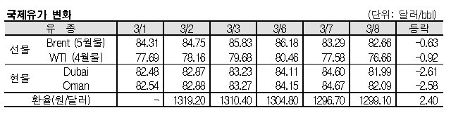3월8일 국제유가는 미국 연준(Fed)의 긴축 우려 영향으로 하락했다. 국제유가는 미국 제롬 파월 연준 의장이 매파적(금리 인상) 발언을 이어가며 긴축 의지를 재차 강조함에 따라 위험자산 투자 심리가 위축된 영향으로 하락세를 이어갔다. 표, 그래프: <국제유가 변화> <화학저널 2023/03/09> |