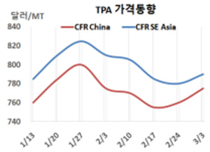PTA(Purified Terephthalic Acid)는 연속 상승했다. PTA 시세는 3월3일 CFR China가 톤당 775달러로 15달러 상승했고 CFR SE Asia도 790달러로 10달러 올랐다. 표, 그래프: <TPA 가격동향> <화학저널 2023/03/09> |
