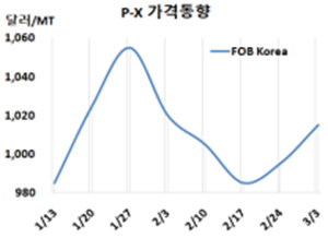 P-X(Para-Xylene)는 상승세가 이어졌다. P-X 시세는 3월3일 FOB Korea가 톤당 1015달러로 20달러, CFR SE Asia는 1035달러로 15달러 상승했다. CFR Taiwan도 1040달러로 15달러 올랐다. 표, 그래프: <P-X 가격동향> <화학저널 2023/03/09> |