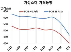 가성소다(Caustic Soda)가 폭락세를 계속하고 있다. 가성소다 시세는 3월3일 FOB NE Asia 톤당 400달러로 65달러 폭락했고, CFR SE Asia는 465달러로 90달러 대폭락했다. 표, 그래프: <가성소다 가격동향> <화학저널 2023/03/10> |