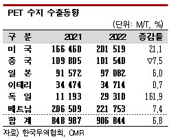 한국은 2022년 PET 수지 수출량이 90만6844톤으로 전년대비 6.8% 증가했다. 중국 수출량이 10만1540톤으로 7.5% 감소했으나 주요 수출처인 미국, 일본을 비롯해 베트남 수출량은 증가한 것으로 나타났다.