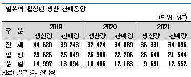 일본은 2021년 활성탄 생산량이 3만6331톤으로 전년대비 3.1%, 판매량도 3만4096톤으로 2.3% 감소했으나 판매액은 200억5600만엔으로 6.2% 증가했다.