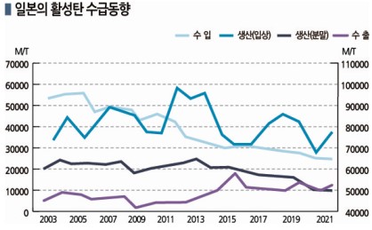 일본은 활성탄 생산량이 2003년 무렵에 비해 절반 수준으로 감소했다.